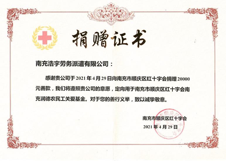 我公司向南充市順慶區(qū)紅十字會捐贈20000元善款